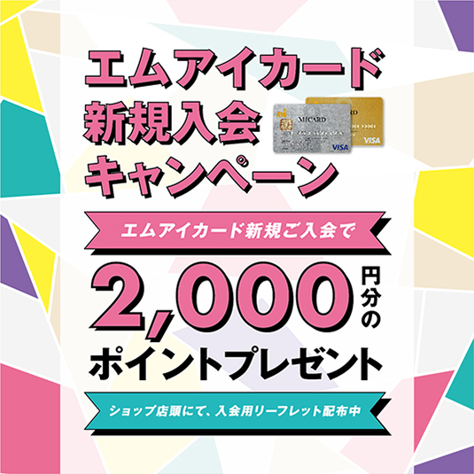 期間中、施設内で配布の申込リーフレット、または本キャンペーンURLより、エムアイカード新規ご入会で2,000エムアイポイントプレゼント‼️