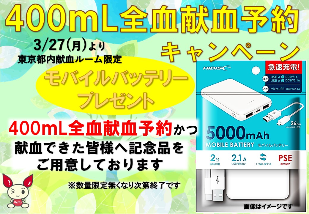 2⃣ 400mL献血 ご予約の方は、ご協力いただけますと、🤩さらに🤩 モバイルバッテリー をプレゼント🔋