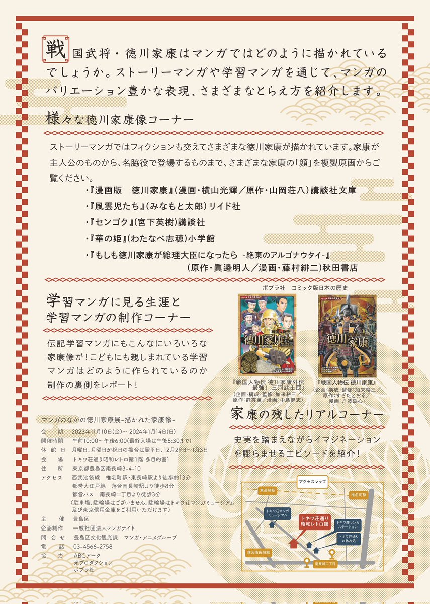 本日より、豊島区昭和レトロ館で「マンガのなかの徳川家康展」がはじまりました!これも学習マンガだ!選出作品『センゴク』『風雲児たち』の複製原稿も展示されています。また、学習まんが制作の裏話も!ぜひ足をお運びください。