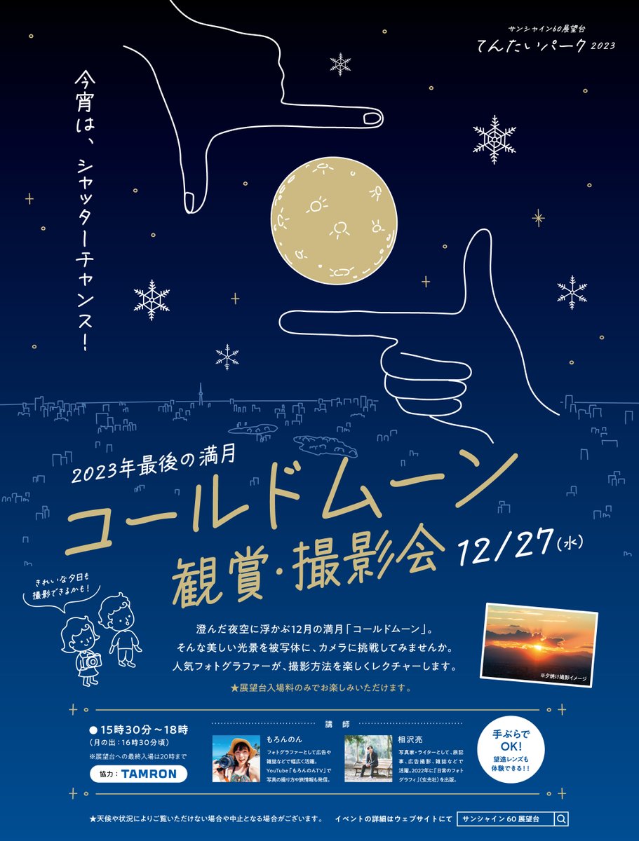 \#てんぼうパーク からのお知らせ/ 12/27(水)#コールドムーン 観賞・撮影会を開催!!🙋♀️ #もろんのん さん #相沢亮 さんに撮影方法をレクチャーいただけます!📷 さらに #TAMRON の #望遠レンズ も体験可能!🌕 #2023年最後 の満月を #展望台 から眺めてみては?🌃 #池袋…