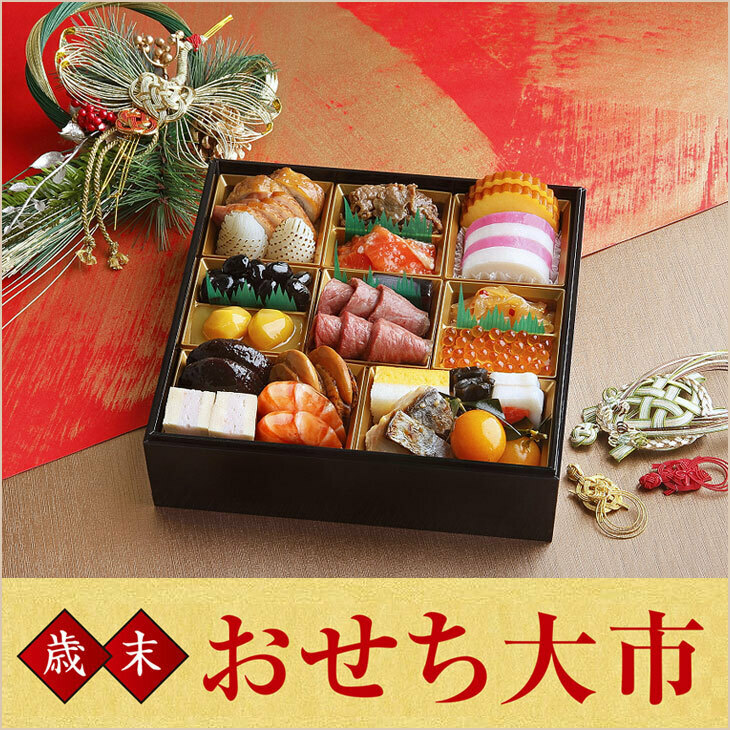 12/31(日)大晦日、西武食品館地下1・2階は午前9時30分開店!歳末おせち大市では、新春の寿ぎにふさわしい名店・人気店の #おせち を取りそろえ。