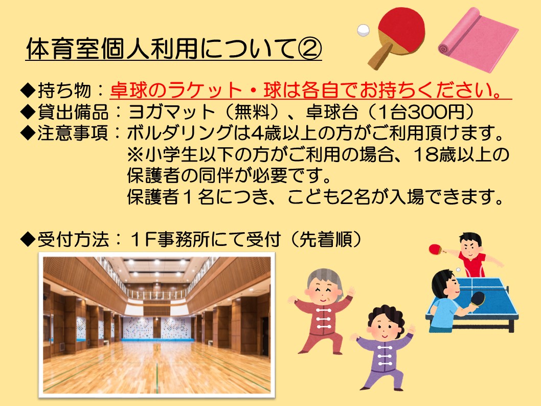 本日1/17、体育室のキャンセルが出ました。個人利用が出来ます。