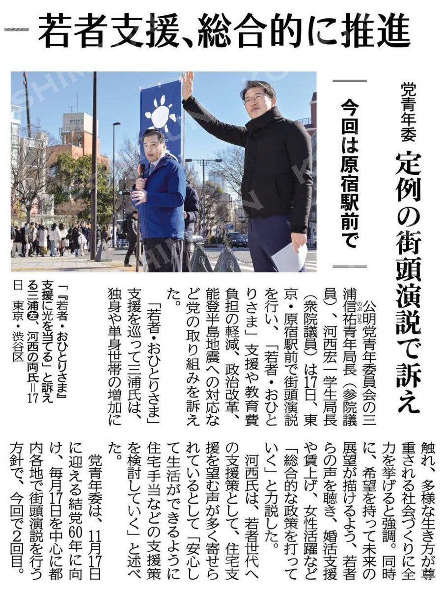 公明党青年委員会の三浦信祐青年局長(参議院議員)、河西宏一学生局長(衆院議員)は17日、東京・原宿駅前で街頭演説を行い、「若者・おひとりさま」支援や教育費負担の軽減、政治改革、能登半島地震への対応など党の取り組みを訴えた。 #公明新聞電子版 2024年01月18日付 www.komei.or.jp/newspaper-app/