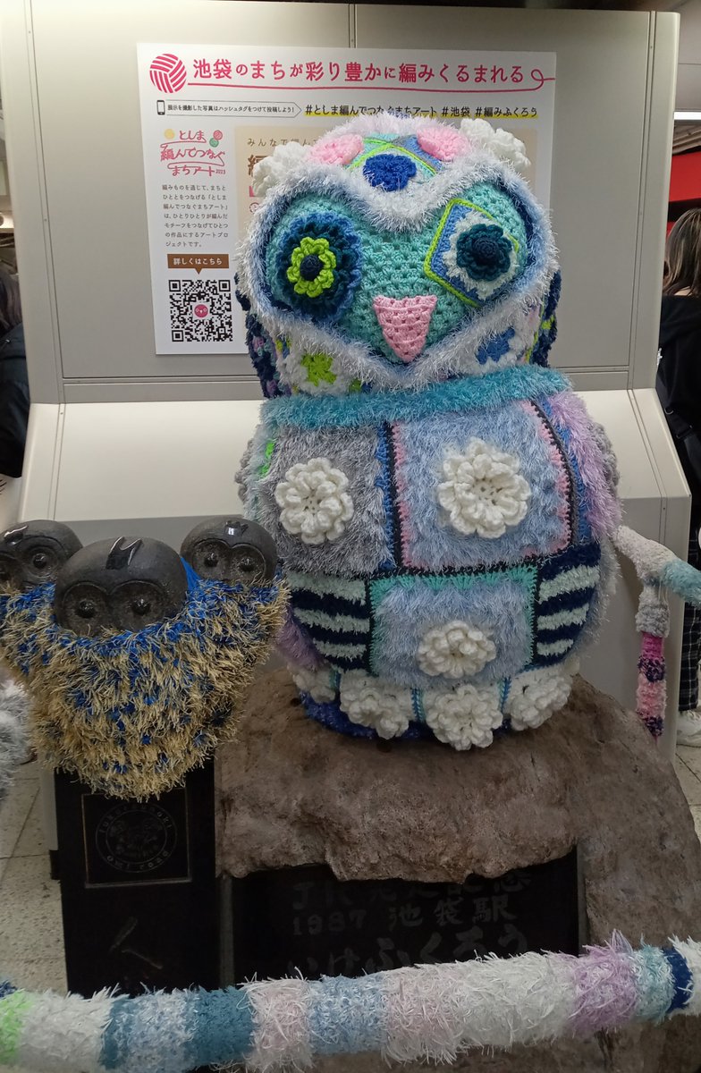 \ヤーンボミングを楽しみましょう/ 現在、池袋の各所で #としま編んでつなぐまちアート2023 が開催中✨ 街中の各所で縫物でデコレーションされた植木・街灯・石像を楽しめます📷 先月に続き、今月は池袋駅地下で発見📷 #ぷらりとしま #豊島区 #池袋 #ふくろう