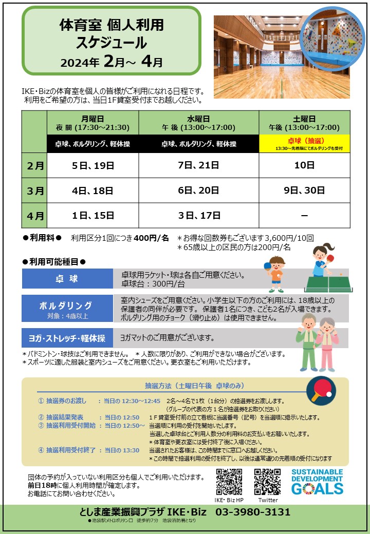 卓球・ボルダリング・軽体操の利用が可能です。(卓球台は別途1台300円)ご予約不要なので、お気軽にお越しください♪