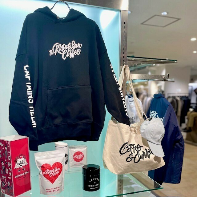 「サーフィンとコーヒー」をテーマに千葉県九十九里に焙煎所を構える「ザ ライジングサンコーヒー」のPOP UP SHOP。焙煎士の坂口憲二さんが自ら焙煎を手掛けたコーヒーをはじめ、バレンタインギフトにもおすすめのオリジナルグッズをご紹介。