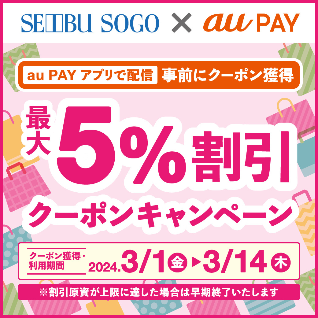 #auPAY アプリ内で配信されている #クーポン を事前に獲得のうえ、対象売場で au PAY(コード支払い)で1会計あたり税込3,000円以上お支払いいただくと最大5%割引に!