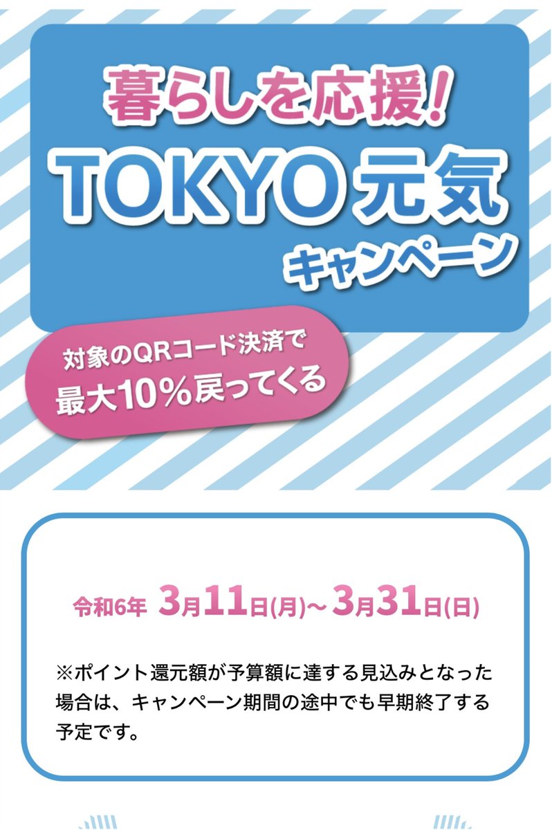 3/11(月)〜3/31(日)の期間中に対象のQRコード決済で最大10%戻ってくる❣