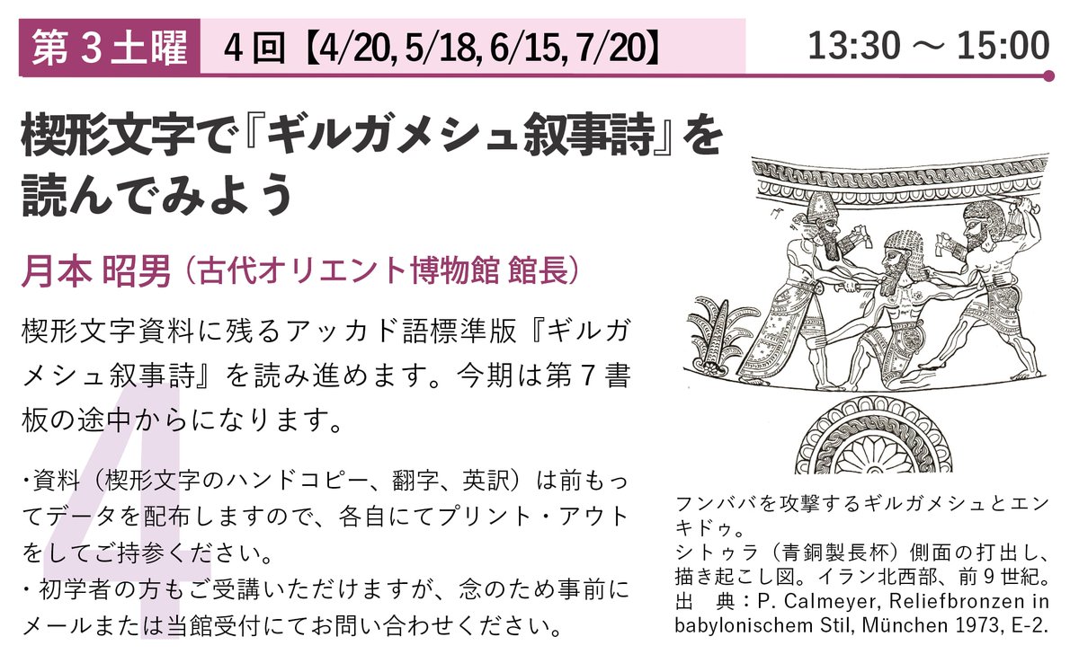 「人類最古の文学」とも呼ばれるギルガメシュ叙事詩を、原典(アッカド語)で読む講座です。