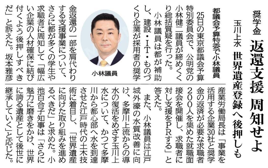 奨学金返還支援、周知せよ/玉川上水の世界遺産登録へ後押しも/都議会予算特委で小林議員 #公明新聞電子版 2024年03月26日付 www.komei.or.jp/newspaper-app/