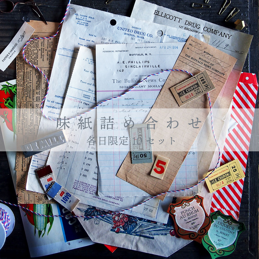 雑誌の切り抜きや使用済書類、古本などなど、コラージュに使える味紙をたっぷり詰め込んで販売致します!