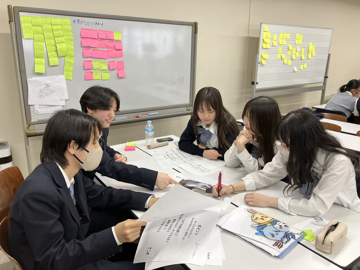 2年生の総合的探求の時間です。クエスチョンストーミングやブレインストーミングを経て、音楽が社会にどのように貢献できるかを考えています。