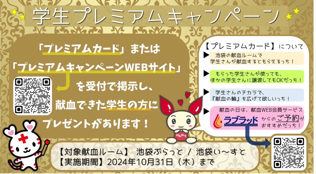 おはようございます 予約状況(6/6) 成分:12:00/14:00予約できます 全血:全時間帯予約できます / 学生プレミアムキャンペーン 実施中です \ カードまたは下記画面を受付で提示して献血できた学生さんにプレゼントをお渡し中 お一人でもお友達とご一緒でも ぜひお越しください