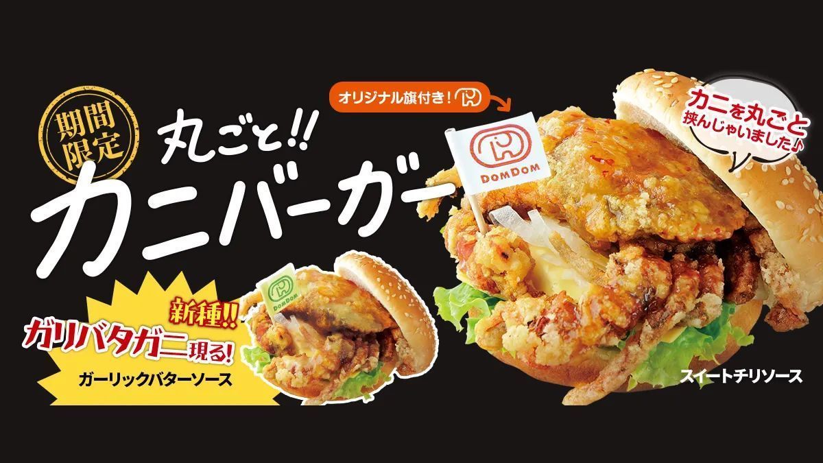 ドムドムバーガー「丸ごと!!カニバーガー」販売中。殻ごと食べられるソフトシェルクラブを丸ごと1匹はさみこんだ豪快なハンバーガー。新味ガーリックバターソースも→event-checker.info/do..