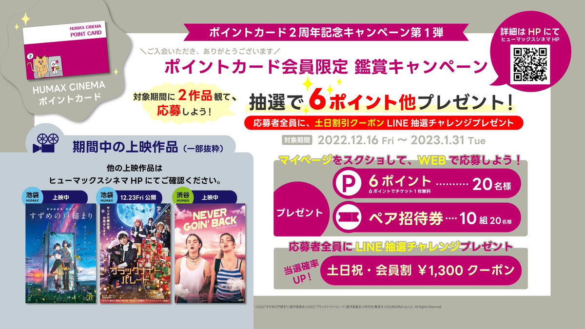 \ポイントカード2️⃣周年記念/ 💕 会員限定 鑑賞キャンペーン実施中👀 💕~1/31までに2️⃣作品を鑑賞&応募で豪華賞品が当たります!※土日祝に¥1300で鑑賞でき..
