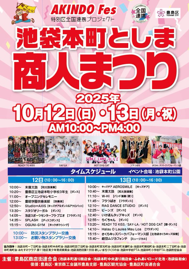 【池袋本町としま商人まつり開催!】日時:10月12日(日)、13日(月)午前10時~午後4時場所:池袋本町公園内容:オープニングセレモニー、スタンプラリー、区内商店および交流都市による飲食、物品販売、..