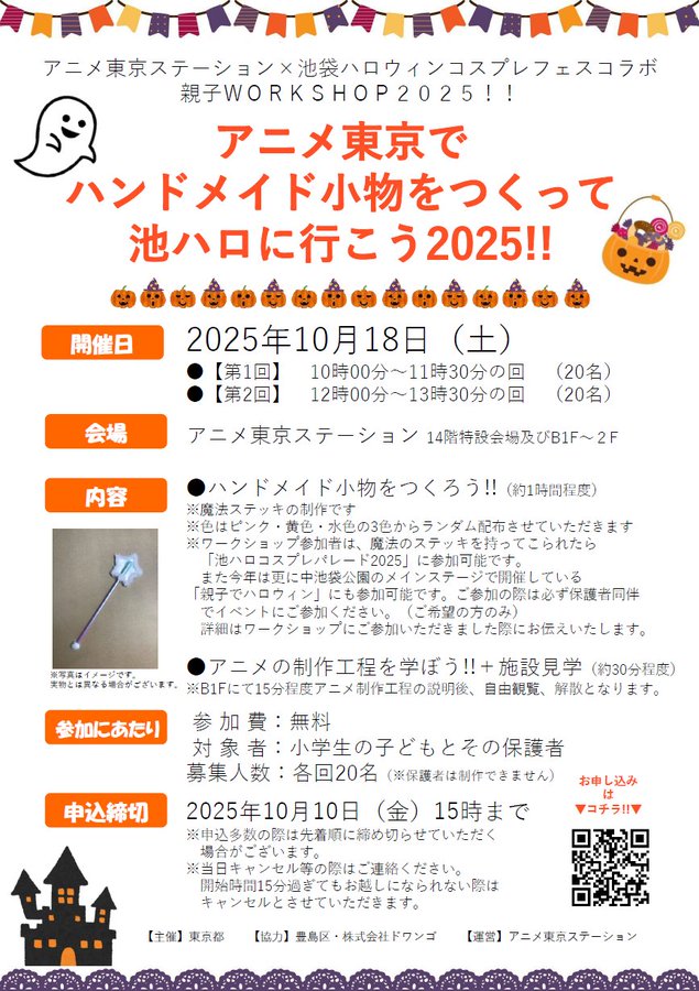 #アニメ東京ステーション×#池袋ハロウィンコスプレフェスコラボ親子WORKSHOP2025!!アニメ東京でハンドメイド小物をつくって池ハロに行こう2025!!無料で参加できるイベントです。10月18日..
