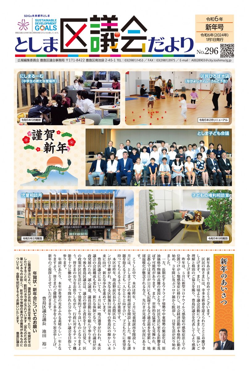 ◆◇謹 賀 新 年◇◆ 【区議会だより令和6年新年号を発行しました】 今回の区議会だよりは議長からの新年のあいさつ、会派等新年の抱負、議員名簿を掲載しております。 電子版は下記リンク先に掲載しております。ぜひ、ご覧ください! #豊島区議会