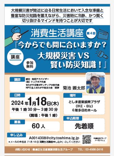第4回 暮らしに役立つ消費生活講座 「今からでも間に合いますか?大規模災害VS.賢い防災知識!」 みなさんの防災知識は万全ですか? いざというときパニックにならないように余裕をもって大規模災害に備えましょう! 詳しくはこちら↓ #豊島区