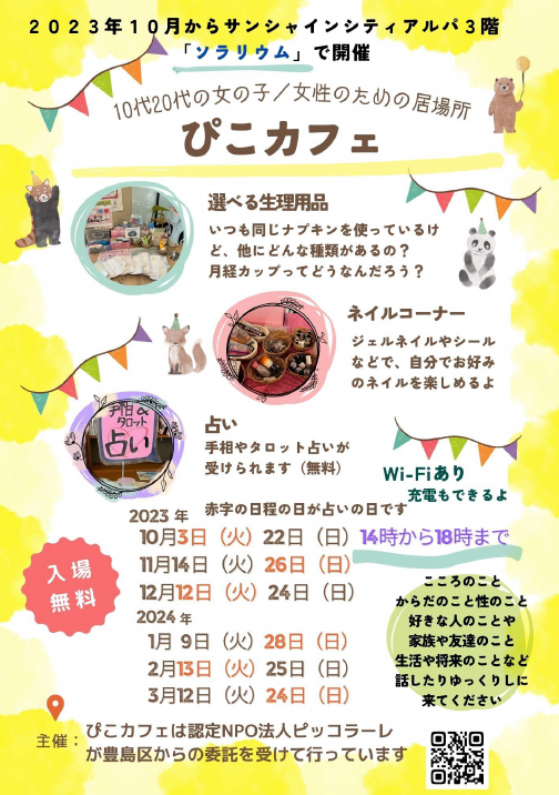 1月9日(火)14時~18時#ぴこカフェ開催!ゆっくりお話しもひとりでのんびりもできる、女の子のための#居場所です。お正月なんだか疲れたな…、そんなときは、サンシャインシティアルパ3Fソラリウムでひと..