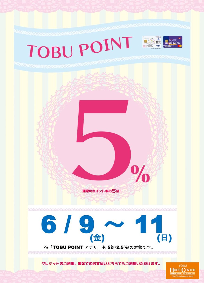 本日6/9(金)から11(日)までの3日間「TOBUPOINT5倍ポイントUP!」を開催‼️お得にお食事やお買物ができるチャンスです✨ぜひこの3日間をご利用ください😊#ポイント#5倍#お得#ポイントア..