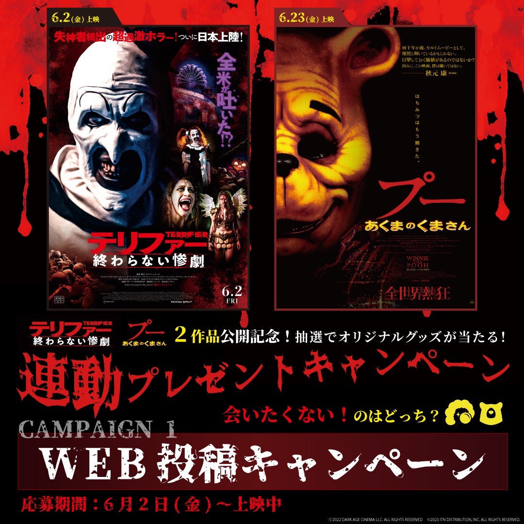 6/2(金)『#テリファー終わらない惨劇』6/23(金)『#プーあくまのくまさん』2作品公開記念🎬WEB投稿キャンペーン抽選でオリジナルグッズが当たる🎯応募期間:本日〜対象作品上映中以下の詳細ページ内..