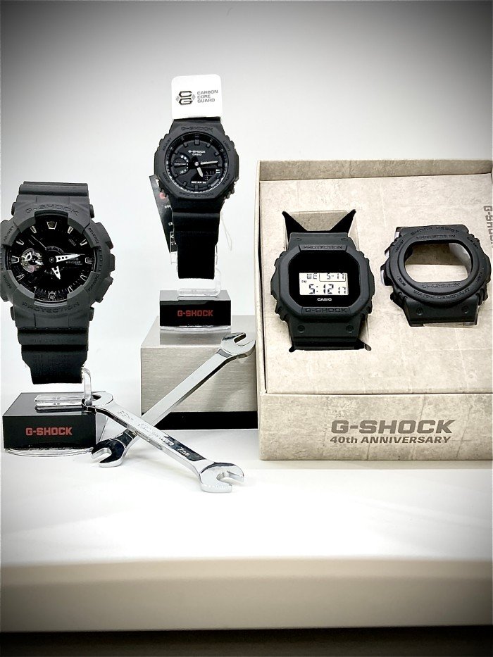 \8階時計コーナーより/5/13発売!G-SHOCK40th紫5段REMASTERBLACKマイルストーンや石碑をイメージし過去40年の歴代モデル名をバンドに刻み全体をオールブラックで仕上げたアニバー..