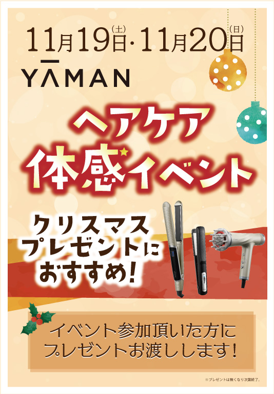 📣本日最終日!4FビューティーコーナーでYAMANヘアケア体感イベント開催中!🦉クリスマスプレゼントにも喜ばれる商品取り揃えております🎁イベント参加者のはプレゼントも!ご来店の際はぜひお立ち寄りくださ..