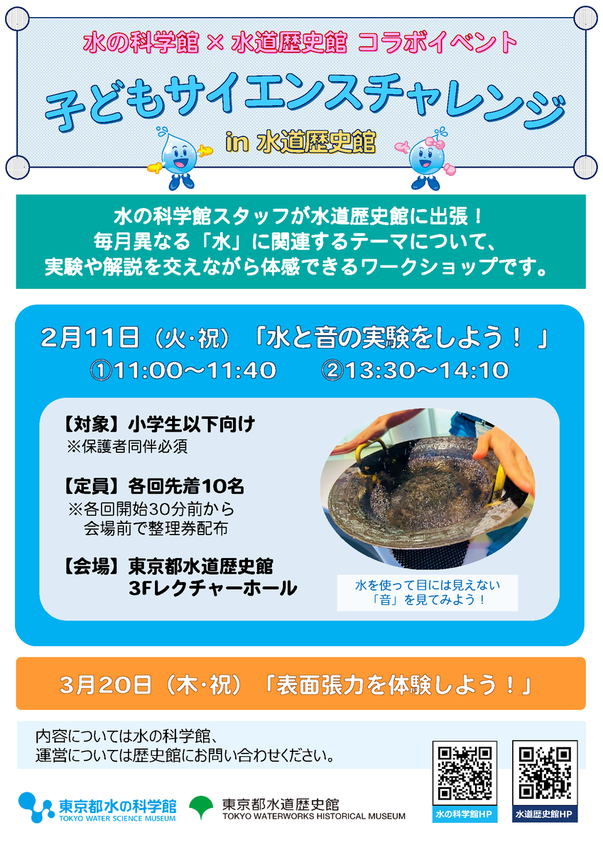 【水の科学館コラボ】今月の子どもサイエンスチャレンジは来週2月11日(火・祝)開催!内容は「水と音の実験をしよう!」です。#水の科学館#水道歴史館#当日定員先着制