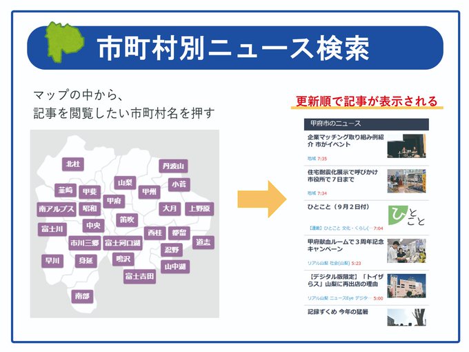 9月から新機能「市町村別検索」がスタート!山梨日日新聞デジタル版担当・20代社員のSです私はカフェ巡りが趣味なので、いろいろな地域へ足を運ぶことが多いんです♪行く先々でお出かけスポットやイベントを調べ..