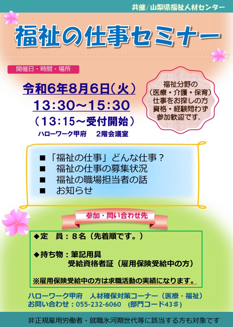 /福祉の仕事セミナー開催\#福祉#介護にご興味のある方、お話だけ聞いてみたい方、ぜひご参加下さい当センターより#キャリア支援専門員が伺い丁寧にご説明いたします時間:13時30分~15時30分場所:#ハ..