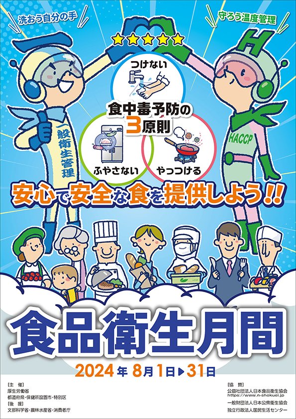 8月1日から8月31日は、食品衛生月間です。夏期は細菌による食中毒が多発し、飲食店だけでなく家庭の食事でも発生しています。普段当たり前にしていることが思わぬ食中毒を引き起こすこともありますので、食中毒..