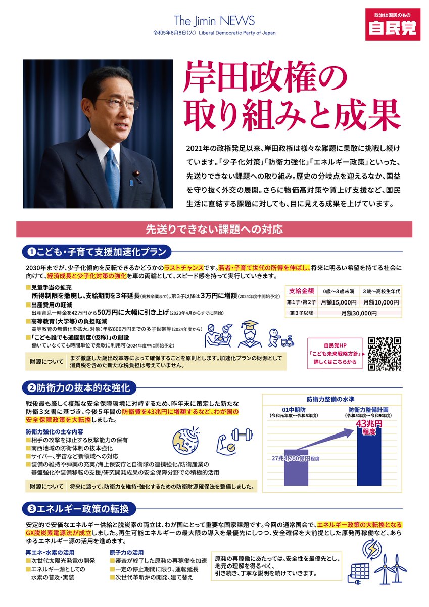 📢岸田政権の取り組みと成果「少子化対策」「防衛力強化」「エネルギー政策」等、先送りできない課題への取り組み。歴史の分岐点を迎える中、国益を守り抜く外交の展開。更に物価高対策や賃上げ支援等、国民生活に直..