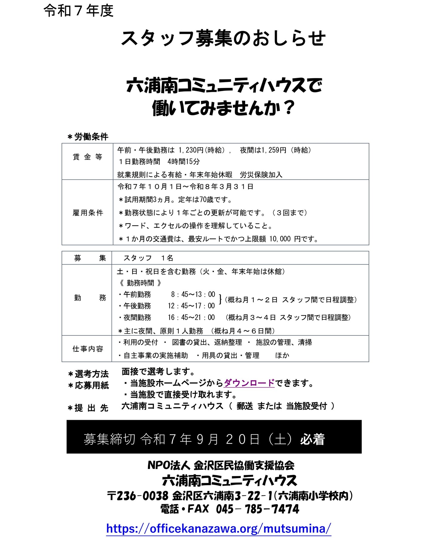 スタッフ募集!!六浦南コミュニティハウスのスタッフを募集します。勤務開始令和7年10月~応募締切令和7..