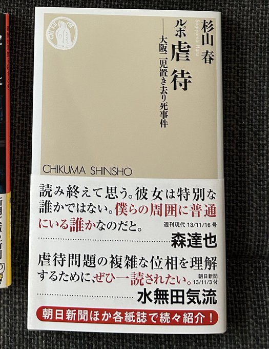 課題図書1冊目読了 ルポ虐待 杉山春 大阪二児置き去り死事件 加害者の母親の両親、元夫、元姑、みんなでこの若い母親を置き去りにし、その母親は我が子を置き去りにして二児が衰弱死した事件 ここで元夫が手を差し伸べていれば、と置き換えて学べる書籍でした 行政のあり方にもヒントを得ました。