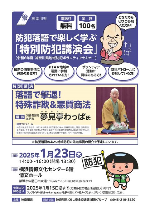 【#落語 で学べる!地域防犯ボランティアセミナー】 令和7年1月23日(木曜)に横浜情報文化センターで、#特殊詐欺 や #地域防犯 を学ぶことができる講演会を開催します。申込は令和7年1月15日(水曜)までです。詳しくはウェブサイトをご覧ください。https://pref.kanagawa.jp/docs/f5g/bohanryoku/training/seminar2024-skillup.html…