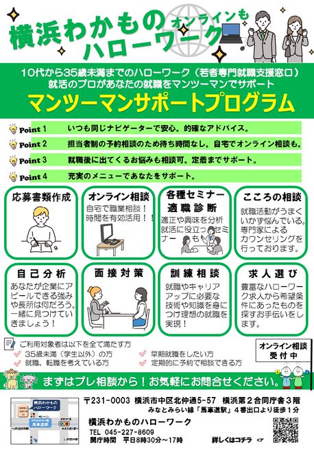 #横浜わかハロ #マンツーマンサポートプログラム 」#早期就職 #早期転職を目指している方へ#キャリアコンサルタント有資格者が、#担当者制で、あなたの#就職活動のすべてを支援します#完全予約制 #短期決戦対象者;#34歳以下の方(学生を除く)https://jsite.mhlw.go.jp/kanagawa-hellowork/list/marumaru/kanrensisetu/_119843.html…