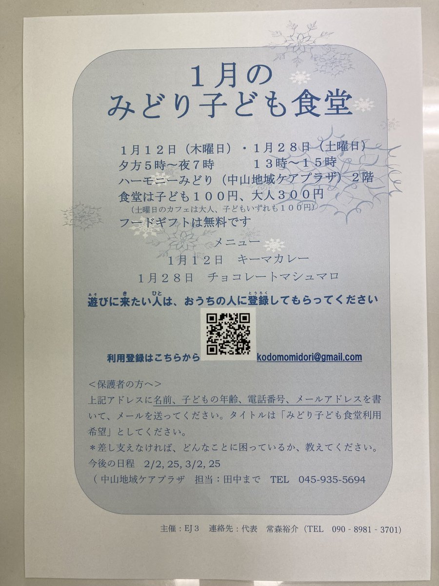#中山地域ケアプラザ(ハーモニーみどり2階)で開催している『みどり子ども食堂』(EJ3主催)。1月12日(木)はキーマカレー、1月28日(土)はチョコレートマシュマロです♪申込先や料金はチラシを参照ください。 #子ども食堂 #フードギフト