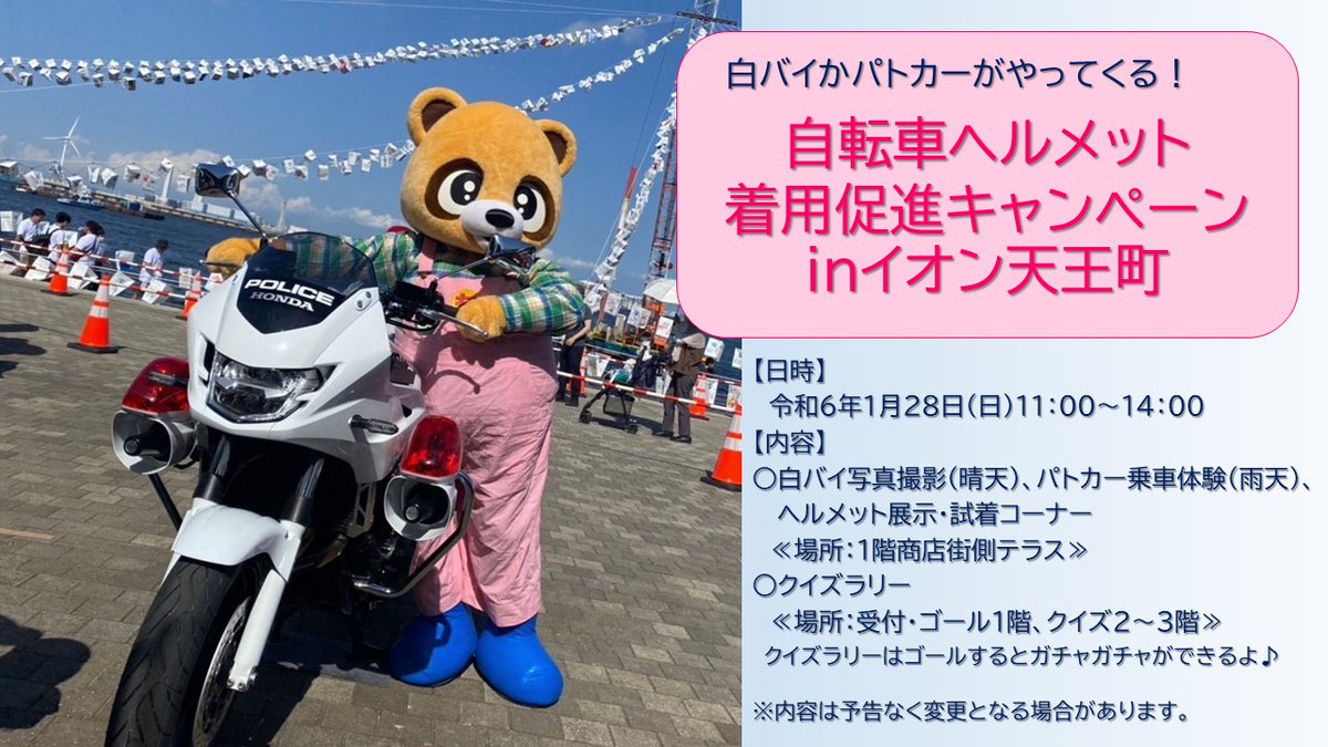 【あと5日】自転車#ヘルメット着用促進キャンペーンを実施します!日時:1月28日(日)11時~14時場所:イオン天王町ショッピングセンターヘルメットの試着会やクイズラリーを実施します✨クイズラリーは、..