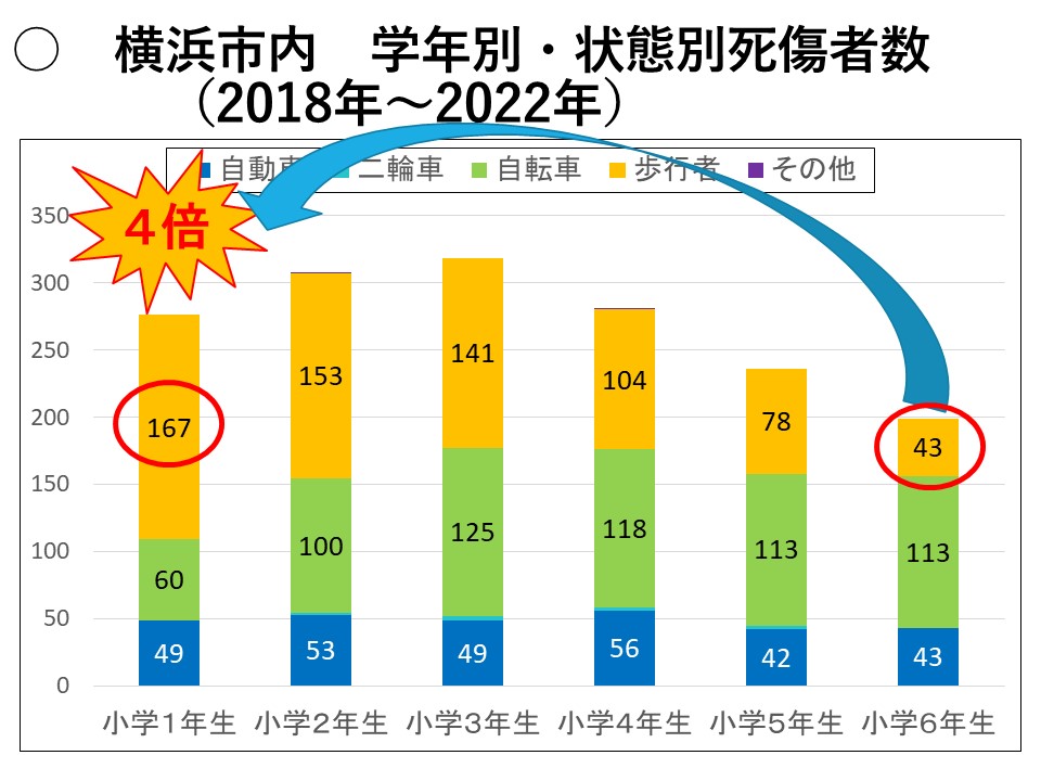 【#新入学児童・園児を交通事故から守る運動】横浜市内の歩行中の死傷者数を学年別で見ると、小学1年生が最も多くなっており、6年生の≪約4倍≫となっています!小学校に入学して一人で道路を歩く機会が増えるこ..