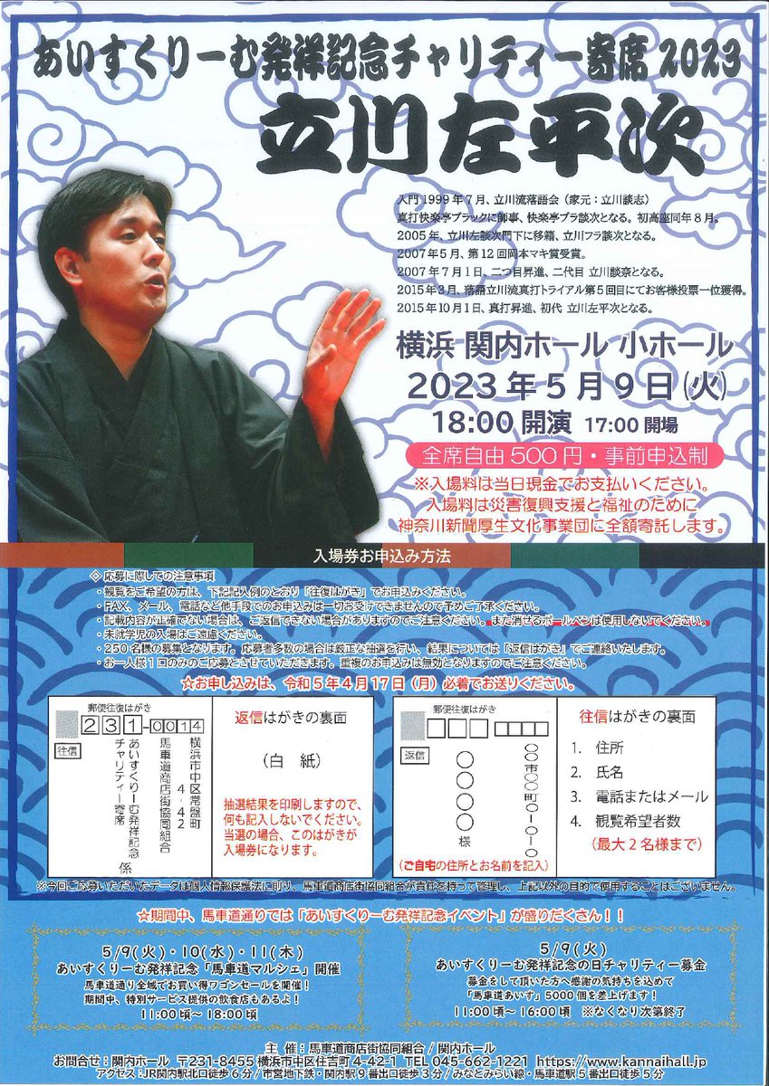 締切迫る!5月9日のチャリティ寄席の入場券お申し込みは、4月17日必着です。詳しくは、ホームページをご覧ください。#馬車道#立川左平次#落語001