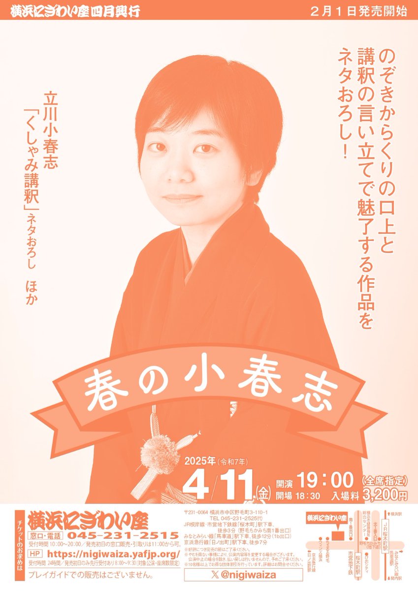 【4月おすすめ公演】4/11(金)19時開演「春の小春志」。出演:立川小春志。のぞきからくりの口上と講釈の言い立てで魅了する「くしゃみ講釈」をネタおろしします。その他、二席口演予定。小春志の落語をたっ..