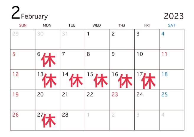 おはようございます☀ 今日から2月ですね✨ 2023年もあっという間に過ぎていきます😊 2月はボイラー交換の工事がある為、休みが多くなっています🙇♀️ 13〜17日の休業日はお間違えのないようお願い致します。