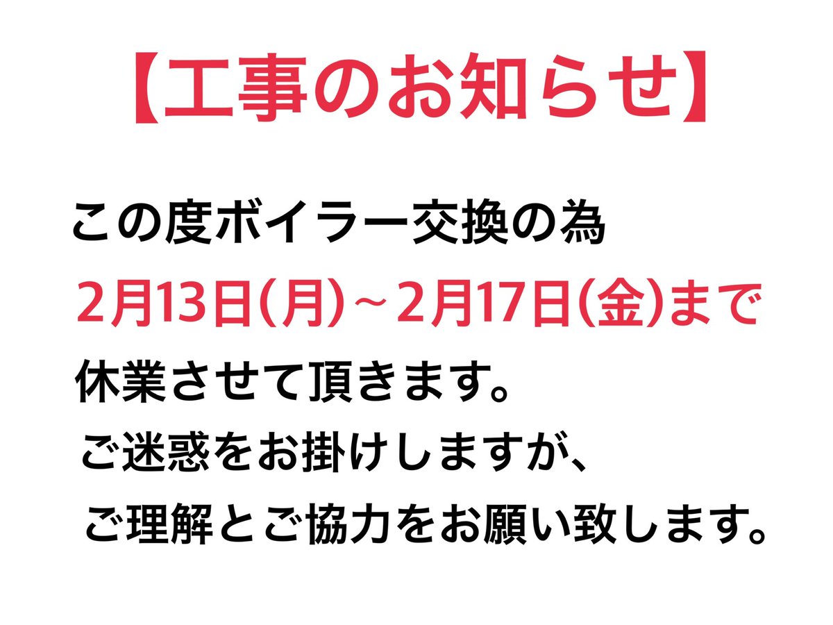 おはようございます☀今日から2月ですね✨ 2023年もあっという間に過ぎていきます😊2月はボイラー交換の工事がある為、休みが多くなっています🙇♀️13〜17日の休業日はお間違えのないようお願い致しま..