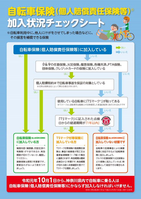 【#自転車マナーアップ強化月間】#自転車保険は、火災保険や自動車保険、クレジットカード、TSマークなどに付帯されている場合があります。チェックシートで加入状況を確認し、未加入の方は必ず加入しましょう▼..
