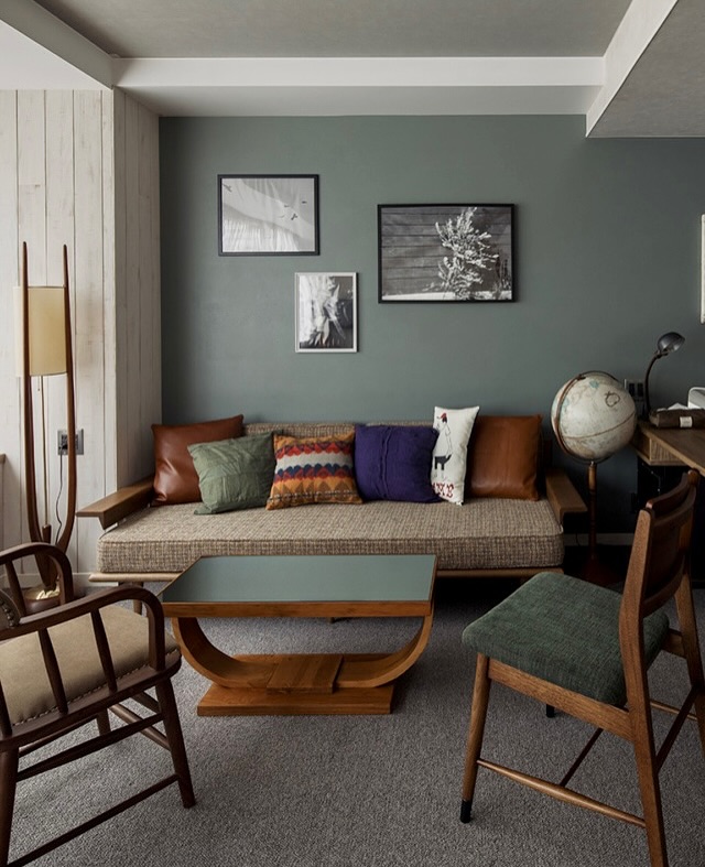 THEKNOTTwin※2種類の部屋タイプがあります。温かみのある無垢のウッドテーブルと、ゆったりしたサイズのソファ。オリーブグリーンの壁に演出されたユニークなインテリアとTHEKNOTROOMだけの..