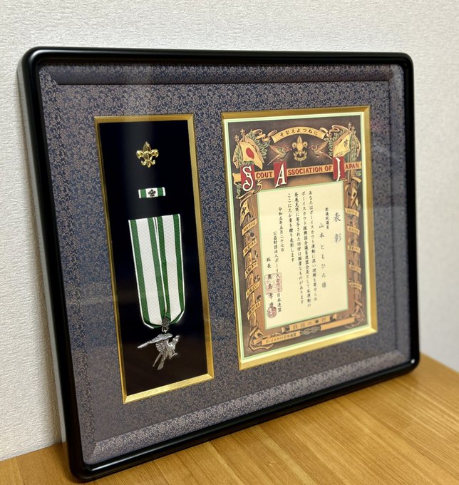 ボーイスカウト日本連盟から頂いた「たか章」を額装!要望をしっかり聞き丁寧に、しかも凄い良心価格の安井商店(千代田区)さんに感謝!勲記・勲章を額装する他店舗は最低約15万円〜の値段設定が当たり前の中、な..