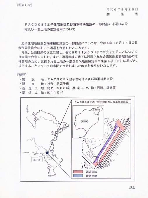 地元逗子市の土地が米軍から一部返還されることになりました。引き続き全面返還を求めていきます。