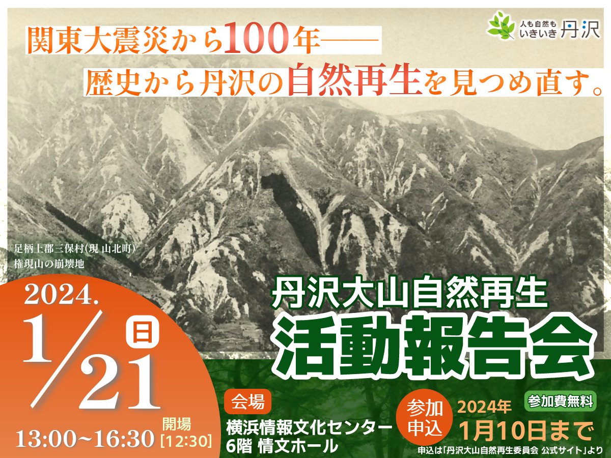 2024年1月21日(日曜)、横浜情報文化センターで丹沢大山自然再生活動報告会を開催します。4年ぶりの対面開催で、「関東大震災から100年」をテーマとした活動報告やシンポジウムなど内容が盛りだくさんで..