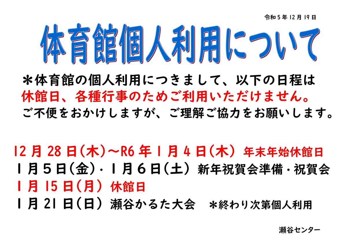 R6.1月体育館個人利用(卓球、バドミントン、バスケットボール)につきまして、ご利用いただけない日は次の通りです。#瀬谷センター#個人利用000